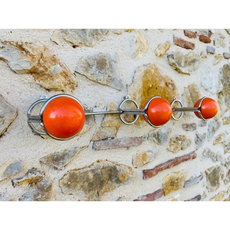 This coat rack has a fantastic, unusual design made of chrome, with three, glossy orange painted, double-sided, wooden ball pegs/hooks (see photos.)