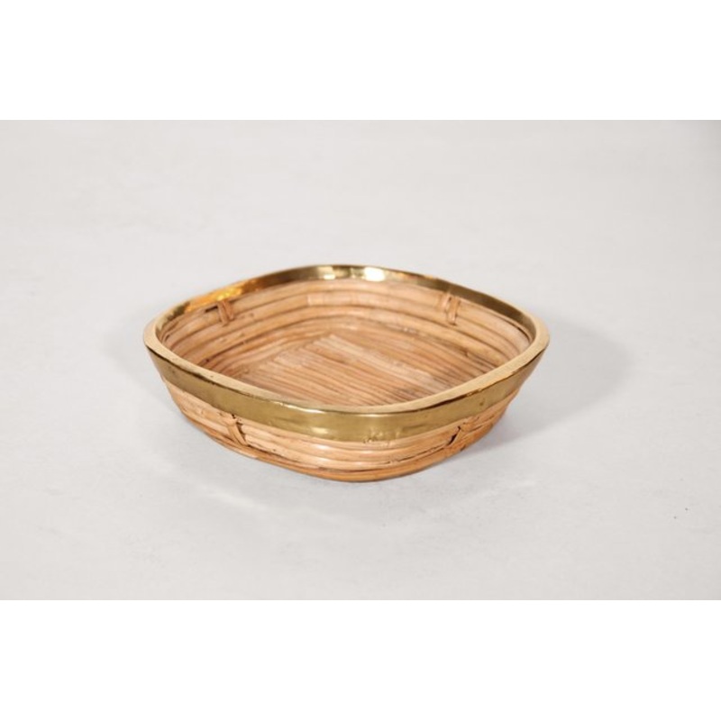 : Beautiful bowl made of hand-woven rattan with solid brass edge. The bowl is square in shape and is a beautiful accessory in the interior with a perfect balance between functionality and aesthetics. This square bowl is 21 by 21 cm and has a height of 5 cm