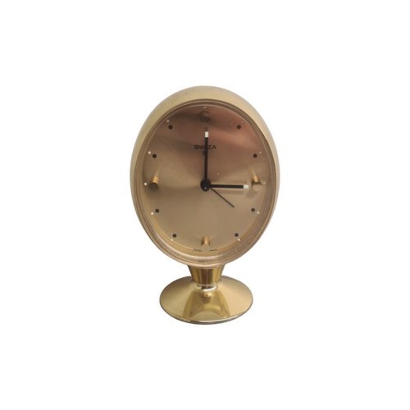 Vintage Swiss desk clock Swiza 8, from the 60s. Beautiful analogue alarm clock or for on the desk with Art Deco influences. A mechanical 8-day alarm clock from Swiza. Oval case on a brass stand with thick glass crystal. Some light signs of use and the top