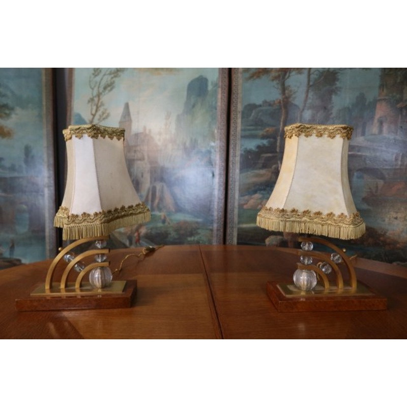 Pair of modernist table lamps from the 1950s/1960s. The base is made of wood, gilded bronze arches surroundglass balls and lampshades are made of parchment.DIMENSIONS: 23cm x 10cm and 38cm high with lampshades Design Period 1950 to 1959 Production Period 1
