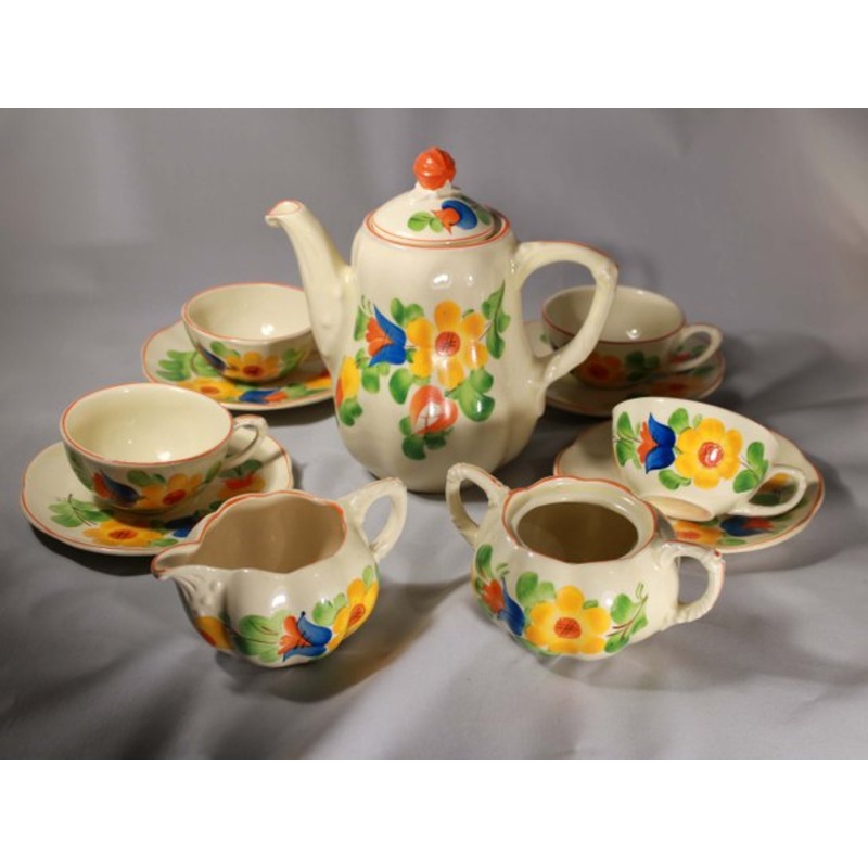 A beautiful, colourful tea set, consisting of 7 pcs. Unfortunately, the sugar cup is missing the lid.Cups have a diameter of 10cm, the saucer has a diameter of 17 cm, the kettle if 22 m tall Design Period 1950 to 1959 Production Period 1950 to 1959 Country
