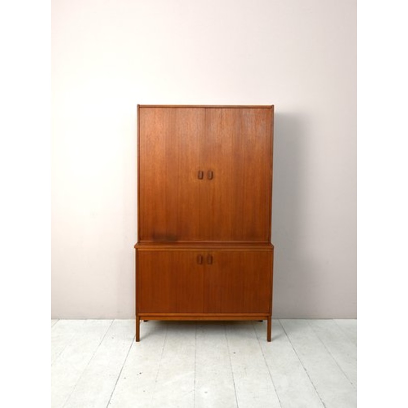 This modest size belief is very large and functional. It consists of two parts, the furniture below is a sideboard with a container compartment equipped with shelves while the upper part is a shelving system closed by two doors. The handle of the doors is in teak wood like the rest of the structure.
