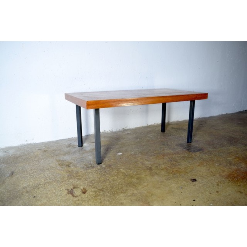 This is a simple side table from the 1960s.The table has straight metal legs and a teak veneer. The table can be used very flexibly due to its compact size. The vintage condition is well maintained with small visible signs of wear on the surface. Mass:Heig