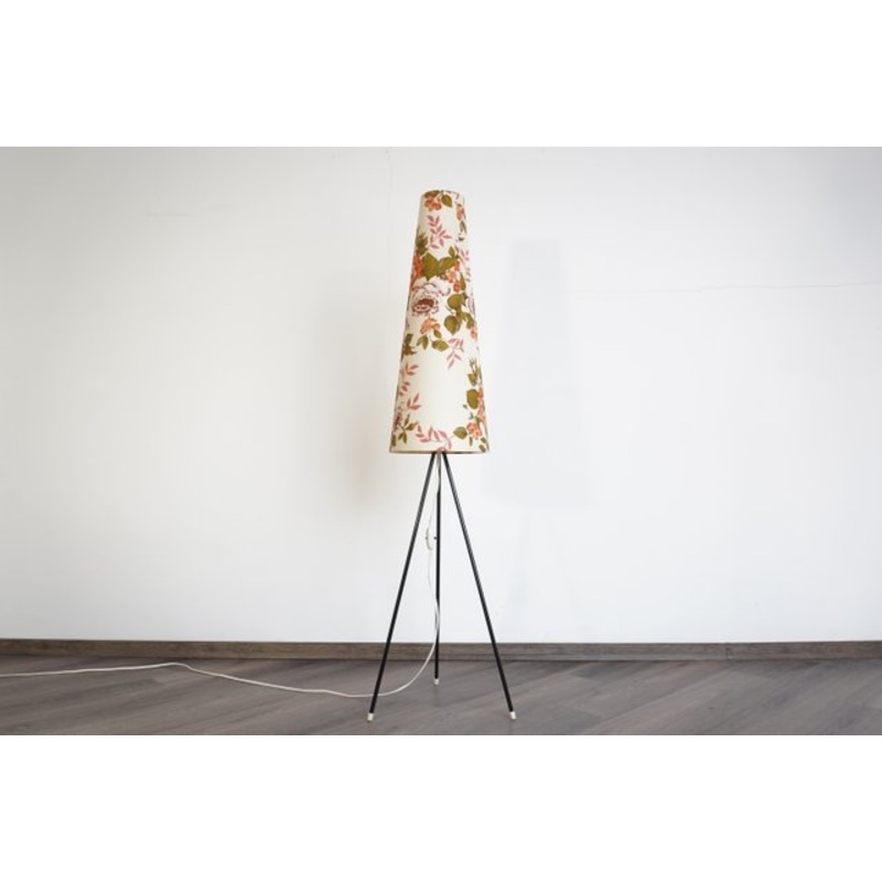 Gorgeous vintage floor lamp made in the 70s in Germany by Aro. This cutie is made from a tripod metal base and conical lampshade with beautiful floral design. This amazing vintage lamp is perfect for everywhere, giving off fabulous light when lit. A great