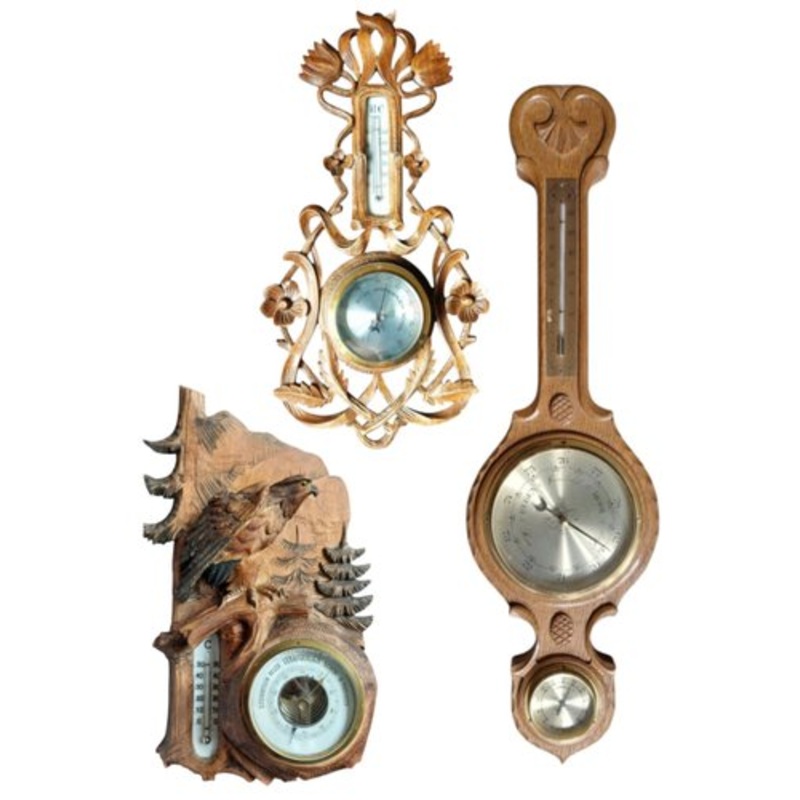 A self-composed lot of 3 different Barometers, weather stations. This lot consists of: - Antikes 19. Jh. Frans Ornately carved Barometer, decorated with leaves, light weight (linden wood).Dimensions Length: 45 cmWidth: 24 cmDepth: 5.5 cm- A vintage Baromet