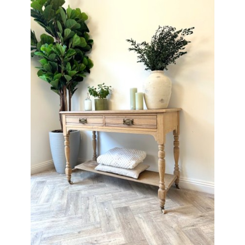Solid wooden vanity unit with two dovetail drawers and shelf set upon castorsThis is a vintage piece and does show small signs of a previous life including small holes on the top at the back (from a previous fixing) and some marks. Any signs of woodworm ha