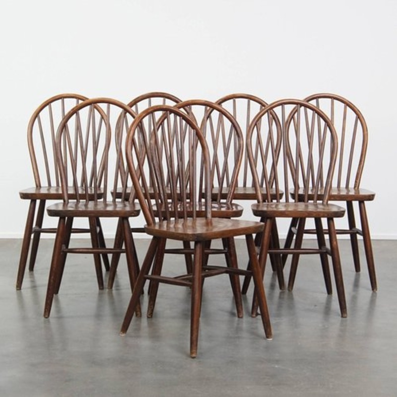 Set of 8 vintage wooden Windsor bar chairs in English style from the 1970s. These great vintage wooden bar chairs from the 1970s in English style are not only suitable for use in a home environment, but they also look great in the catering industry or an office environment. The chairs have normal signs of wear from years of use, see photos. Structurally they are still in a good condition and can of course be used immediately and with appropriate use you will enjoy these nice chairs for many years to come! Dimensions: Height: 92 cm Width: 41 cm Depth: 52 cm Seat height: 46 cm Seat depth: 37 cm