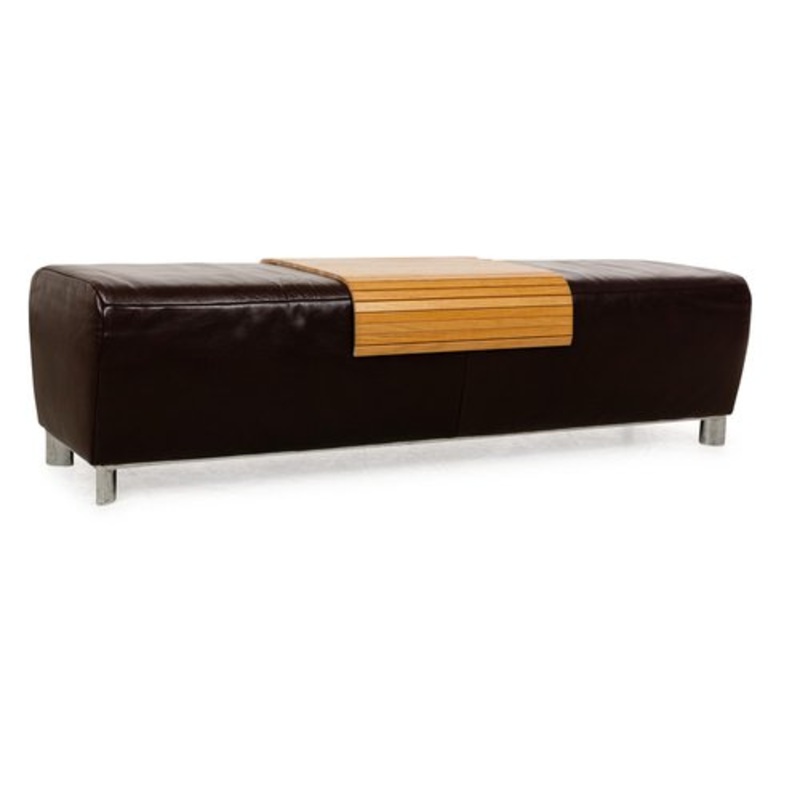 The Volare stool by Koinor is covered in brown leather and stands on a narrow, all-round metal frame that ends in short legs. A practical wooden shelf makes this stool also usable as a small, low coffee table.