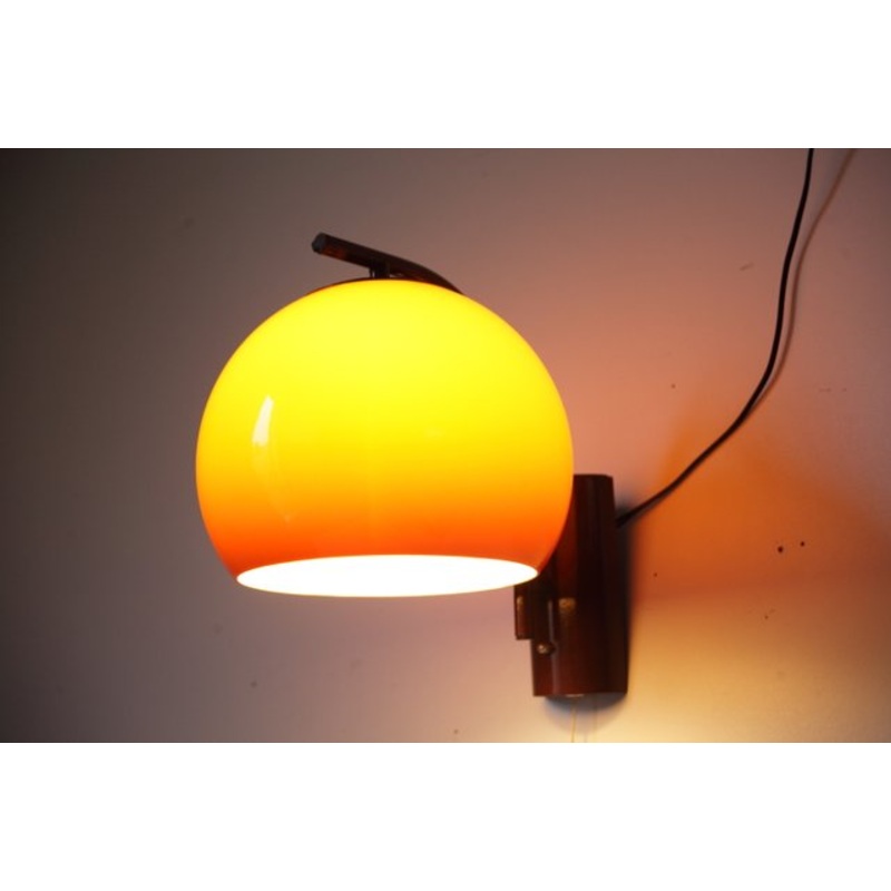 Very good original coditon. Cleaned and polished. Plastic shade without damage. Made in Hungary. Up to 60 Watt. Shade diameter is 20 cm. Height is 26 cm, depth is 28 cm. Switch is by pulling the string up and down. On request I will add cable with a switch free of charge. Marked with a label sign.