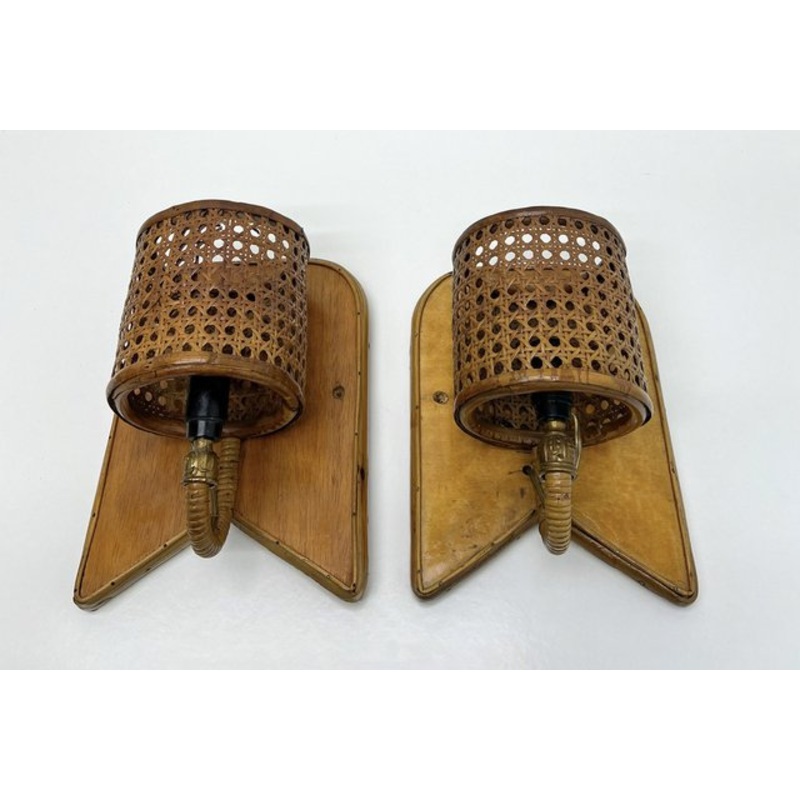 A rare 1950s set of Wall Lights from France,in the style of Louis Signot.They are made of a combination of bamboo wood and cane, among others, and have an unusual design.A wonderful example of Mid-Century craftmanship! Handmade, the dimensions are therefor