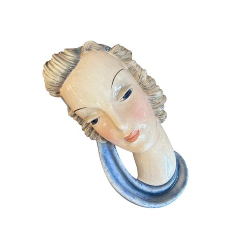 Wall mask woman's head by Adolf Prischl from the 1920sManufactured by Goldscheider Vienna Ceramic, painted, glazed Creator Adolf Prischl Manufacturer Goldscheider Manufactory of Vienna Design Period 1920 to 1949 Production Period 1920 to 1929 Country of Ma