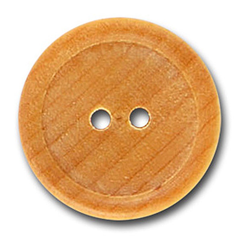 Two-hole, polished, warm oak brown wood button, with a thin rounded rim.