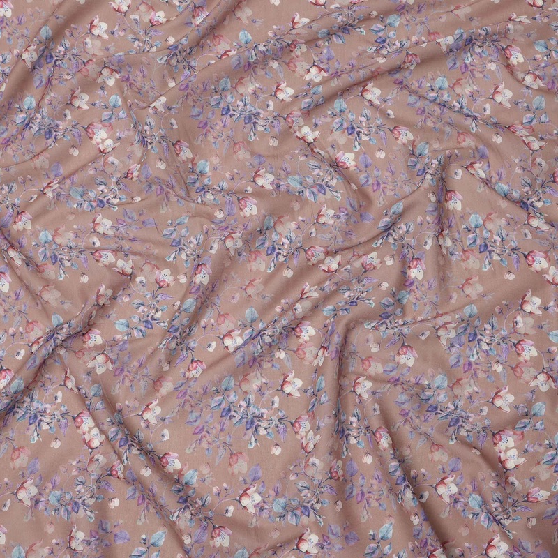 Bring earthy sophistication to your fabric collection with this warm taupe base blue and purple floral digital printed cotton lawn fabric, a harmonious blend of muted elegance and delicate charm. The soft taupe background is beautifully adorned with digita
