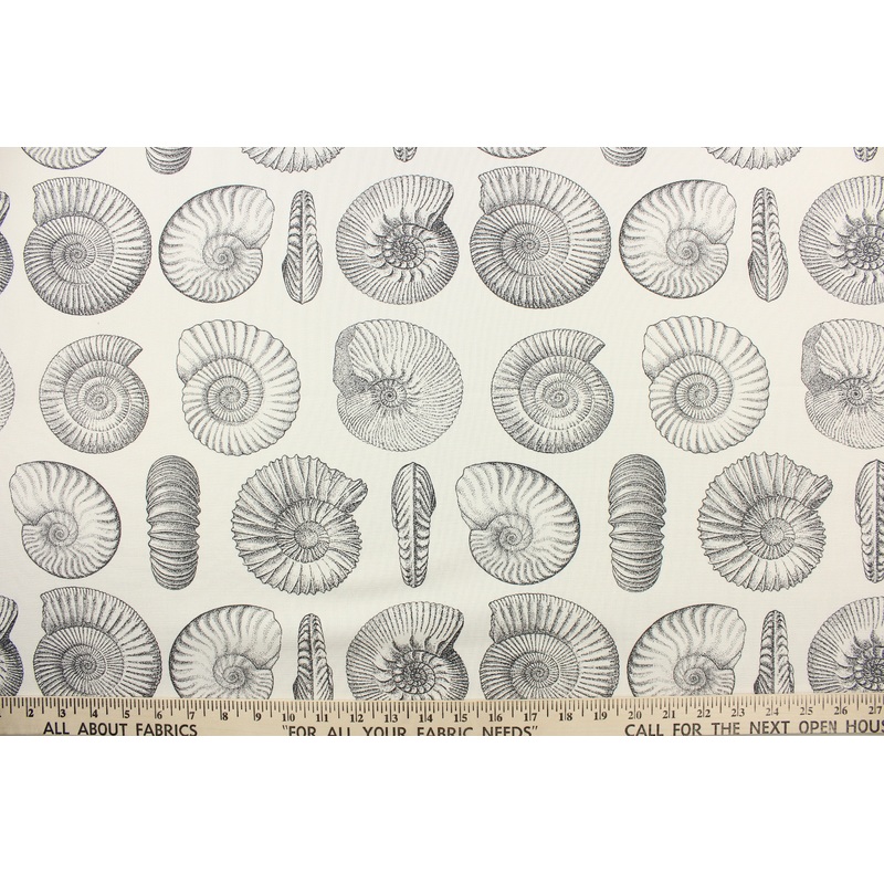 WIDTH: 54"PATTERN REPEAT: V. 12.5" X H. 13.5"WT PER SQ YD: 7 OZ.PRIMARY FIBER : 100% CottonDESCRIPTION: This fabric features a seashell design in gray and black against a dull white . Use this for bedding, pillows, upholstery, drapery, etc. It has a durabi