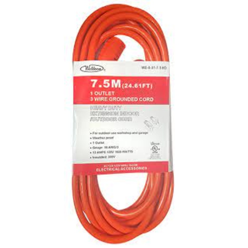 This extension cord made by Wellson is super heavy duty because it is made specifically for outdoor use. It is 7.5 meters in length and is weather proof.Features:- 1 outlet- 3 wire grounded cord- 16AWG/3- 13A, 125V, 1625W- Insulated: 300V- Suitable for use
