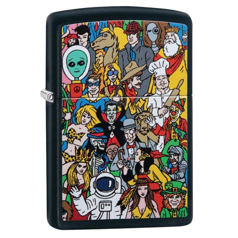 This lighter appears as the first of its kind on zippo.com! Can you spot one of Zippo's famous icons, Windy? She is hidden in this color imaged design between an array of characters, only true Zippo fans will find her. The design is finished on a Black Mat