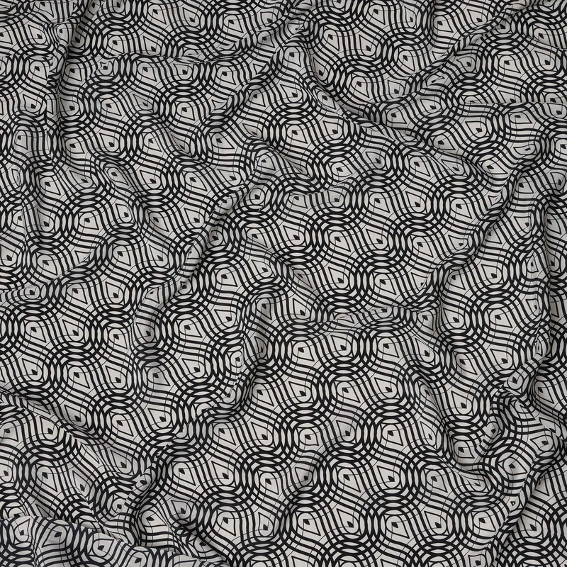 Elevate your style quotient with this striking white and black optical maze print pure silk crepe fabric, crafted to captivate with its contemporary edge and luxurious feel. The white base forms a crisp canvas for the hypnotic black geometric maze patterns, evoking an illusion-like effect that adds dynamic movement to any outfit. Made from 100% pure silk, this crepe fabric has a smooth yet subtly textured handfeel and an effortlessly graceful drape. Its 110 cm width allows for a broad range of high-end garment designs including dresses, shirts, kaftans, and scarves. The monotone palette makes it versatile for both day and evening wear, while the bold print ensures it never goes unnoticed. Ideal for designers and fashionistas seeking a fabric that speaks modern luxury with minimal effort. Dry clean recommended to maintain the fabric’s brilliance, structure, and long-term finesse.