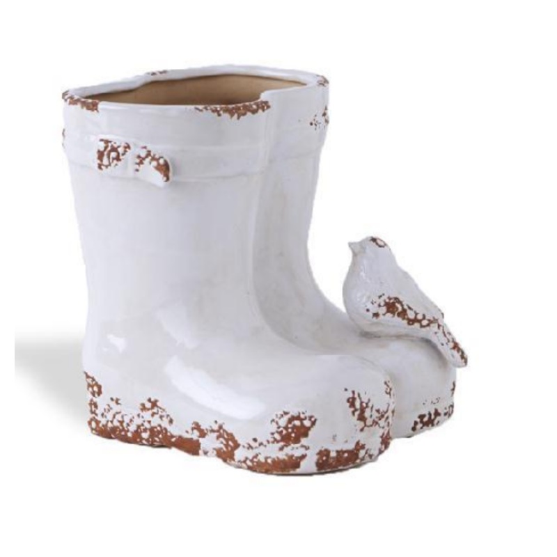 White Ceramic Weathered Garden Boots Vase W/Bird13271B7.5H x 6W x 7DBirds, Floral, Container, Antique, Distressed, Ceramic