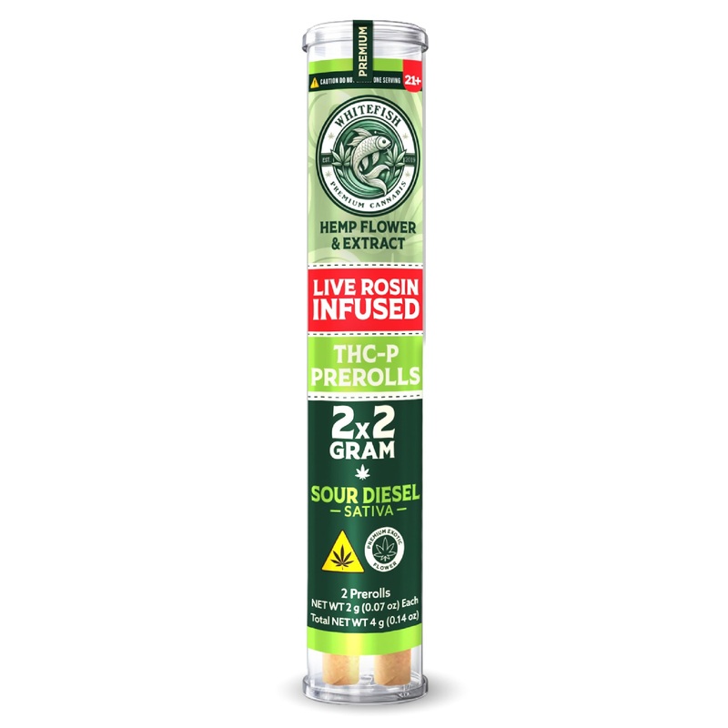 Dive Deep Into the Gas with White Fish Live Rosin THC-P Pre-Rolls! Two premium 2g pre-rolls per pack Live rosin extracted THC-P for maximum terps Premium indoor-grown flower base RAW rolling papers for that clean burn 4 grams total of pure fire Description