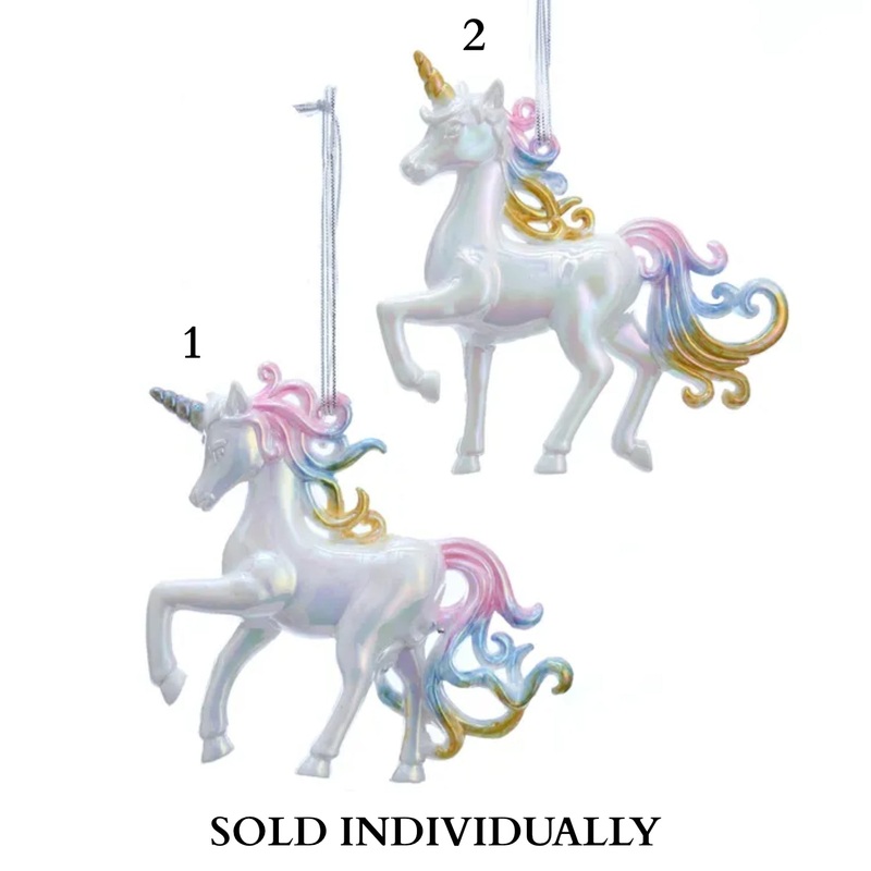 This white iridescent unicorn ornament from Kurt Adler is a whimsical addition to your home or holiday dcor. Each unicorn features a pastel multi-color mane and tail and either a silver horn or a gold horn.Made of plastic and polyesterHangs from white ribb