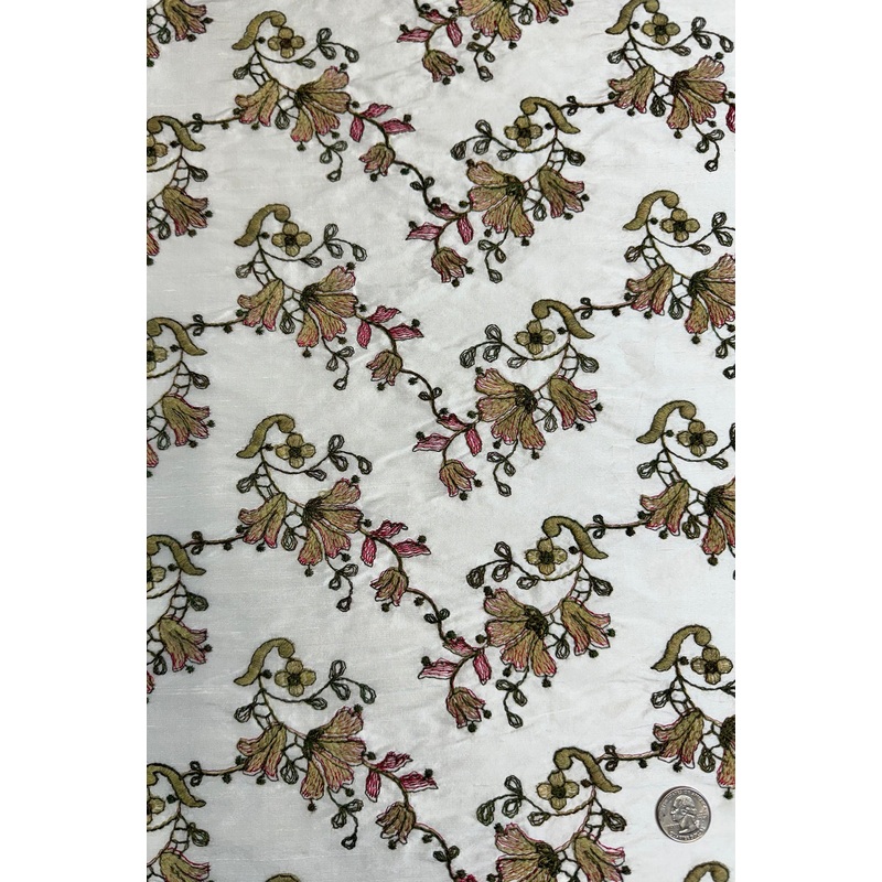 White/Multicolor Embroidered Dupioni Silk Fabric is soft, medium weight fabric mostly used for interior designs. Distinguished by its patterned design, this high-quality fabric is a perfect choice for special occassions. Our unique and distinctive fabric is available in a wide selection of colors. The fabric is sold by the Yard, and measures 60 in width.