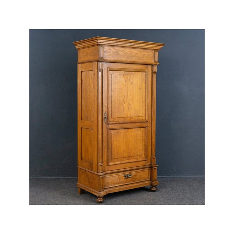 Object: Linen cupboard Epoch & style: Wilhelminian style – second half of the 19th century Features – mostly made of solid oak – doors and side walls in frame construction – headboard with surrounding cornice and profile strip – three shelves inside, also made of solid oak – pilaster strips, each with double profiled frames – Feet typical of the era – Brass fittings – Key available The furniture is in good condition with age-related signs of wear. Dimensions: Width 98cm Depth 56cm Height 184cm