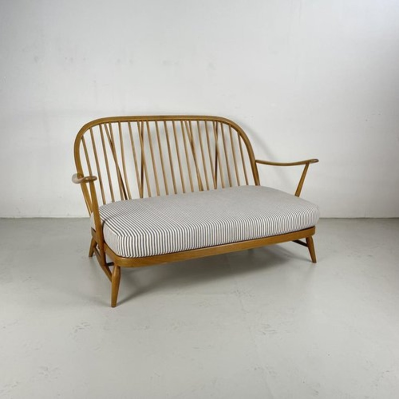 Refurbished Ercol Windsor 2 seater sofa in original blonde finish. Newly upholstered in a French ticking navy blue stripe cotton/linen mix fabric and new foam. This piece is in good vintage condition. It has been fully refurbished and the webbing is brand new. The frame is solid and sturdy. There are a few scuffs, scratches and marks to be expected with age but nothing which is too noticeable. Approximate dimensions: Length: 134cm Depth: 85cm Height: 78cm Seat height 35cm