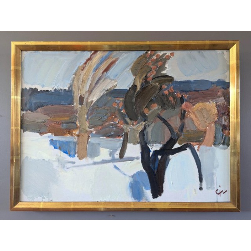 An atmospheric mid-century modern landscape painting captures a windswept winter scene with a rich, expressive impasto technique, painted in oil onto canvas. The composition features a grove of abstracted trees bending under the force of the wind, their forms defined by thick, gestural brushstrokes. The background consists of rolling hills and a distant horizon, suggesting a rural or natural setting in the colder months. Executed in a semi-impressionistic yet abstract manner, the artist has used a restrained but effective muted colour palette dominated by cool whites, icy blues, and deep browns, punctuated by warm subdued shades of orange and yellows. The brushwork is dynamic and textured, with visible bold, sweeping strokes that emphasise movement and energy. The interplay between thick layers of paint and areas of exposed canvas adds to the raw, expressive quality of the piece. This oil on canvas is housed in a complementary gilt frame. The painting is in excellent vintage condition. The frame has some losses to the edges, as shown in close ups. Size: 43 x 58cm (including frame)