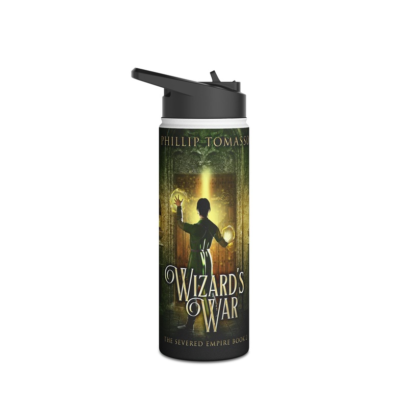 Quench your thirst in style with this 18oz stainless steel water bottle featuring a double-wall stainless steel build that keeps your drinks frosty for 24h and soothingly hot for 12h. This BPA-free, steel water bottle comes with a twist-on lid for easy sipping, making it excellent for daily use at work, at college, in the car, and beyond. The cover art in this water bottle is from Phillip Tomasso’s book, Wizard’s War.