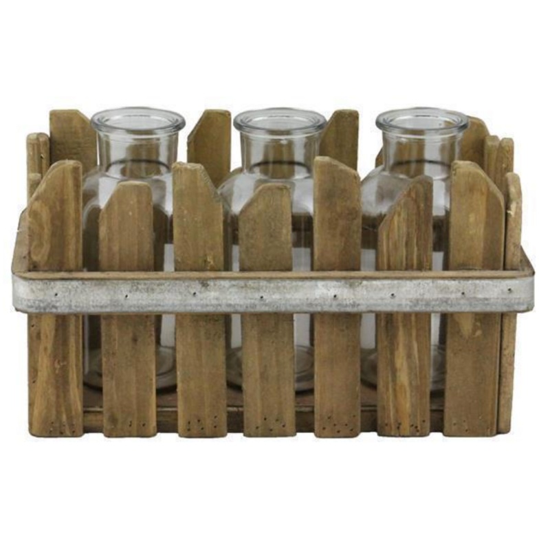 AW2088Wood Slat Tray w. 3 Glass BottlesDriftwood Frame, w. Metal Ribbon Detail and (3x) Glass Bottles14.5"L x 12"H x 6"DWood, Glass, Display, Decor, Organize, Centerpiece