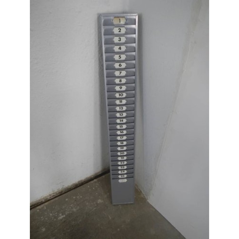 Schedario usato per contenere cartoncini conteggio entrate e uscite degli operai. In metallo grigio con gancio per appenderlo. Con 25 numeri in carta bianca. Il numero 1 presenta dei difetti.