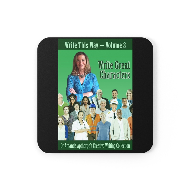 These coasters are made with a high-gloss top and feature a cork back to prevent sliding, and each order comes with a set of four coasters. The cover art in these coasters is from Amanda Apthorpe's book, Write Great Characters.