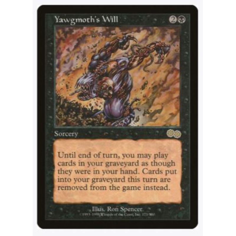 Until end of turn, you may play cards in your graveyard as though they were in your hand. Cards put into your graveyard this turn are removed from the game instead.Rarity:R#:171Card Type:SorceryCasting Cost:2B