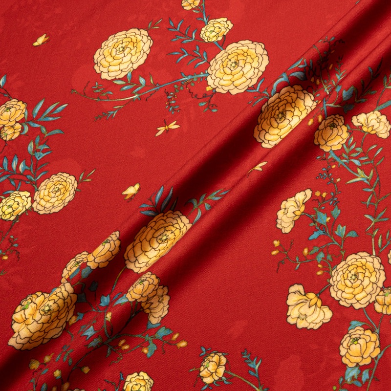 A deep yellow floral print on a red pure merino wool. This lighter weight wool cloth tailors especially well for a dress or skirt and available in a variety of colour ways and prints.