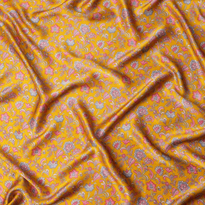 Radiating warmth and vibrancy, this yellow silk satin fabric is beautifully adorned with intricate Mughal-inspired floral prints in shades of soft pink, ivory, and silver grey. The lustrous satin finish accentuates the refined detailing of each blooming fl