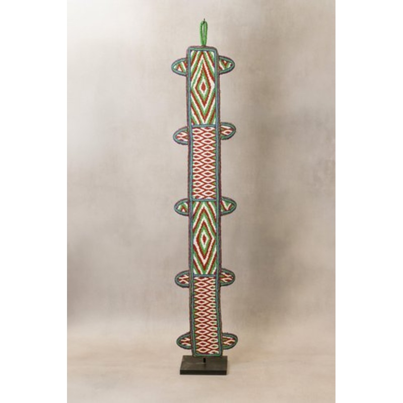 These inventive and meticulous beaded sashes are symbols of the owners spiritual position and are worn in public ceremonies by the Ifa Priestesses. Produced by hand using thousands of tiny glass beads the same beads used in the Yoruba Royal chairs and Royal Crowns, take many weeks to create. The beads are intricately placed onto Ashoke cloth. They are usually designed with animal and geometric patterns. They can be hung on a wall as a piece of wall art or stood on their stand which comes with this piece. Size: 150cm H x 26cm W Base Depth: 20cm