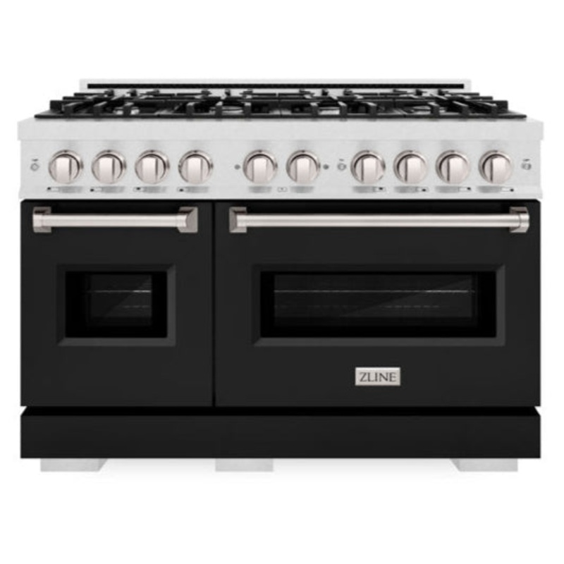 Luxury isnt meant to be left desiredits meant to be attainable. The ZLINE 48 in. 6.7 cu. ft. Classic Double Oven Gas Range with 8 Burner Cooktop in Satin Stainless Steel with Black Matte Doors (CGRS-BLM-48) combines the elegance of a hand-finished porcelain gas cooktop with 8 Italian-made auto-reignition burners, a large gas convection oven with an energy-efficient cooling fan to ensure quiet operation, a small baking oven, and beautiful black matte doors with Landscape window designs allowing you to master every meal. With a modern, timeless style and refined functionality, ZLINE Classic Gas Ranges are masterfully crafted to deliver an elevated culinary experience.