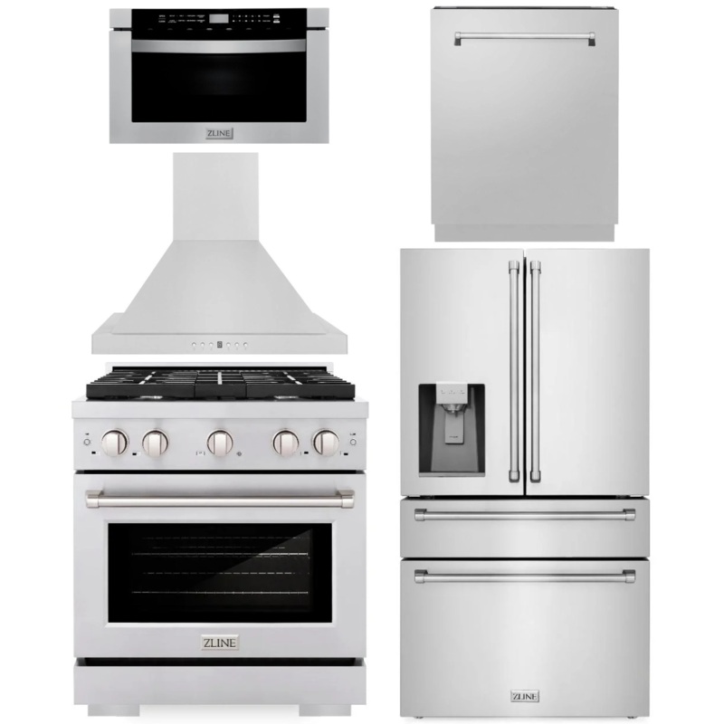 OO621835297437ZLINE Appliance Package – 30″ Dual Fuel Range, Range Hood, 36″ Refrigerator with Water/Ice Dispenser, 24″ Microwave Drawer and Dishwasher in Stainless Steel