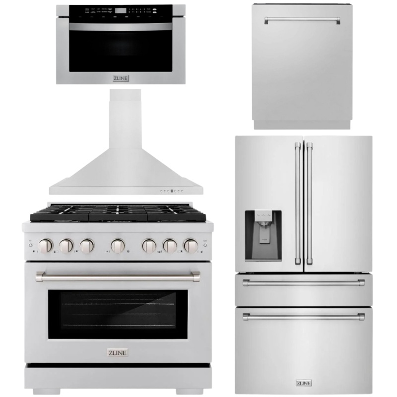 OO621835297427ZLINE Appliance Package – 36″ Dual Fuel Range, Range Hood, 36″ Refrigerator with Water/Ice Dispenser, 24″ Microwave Drawer and Dishwasher in Stainless Steel