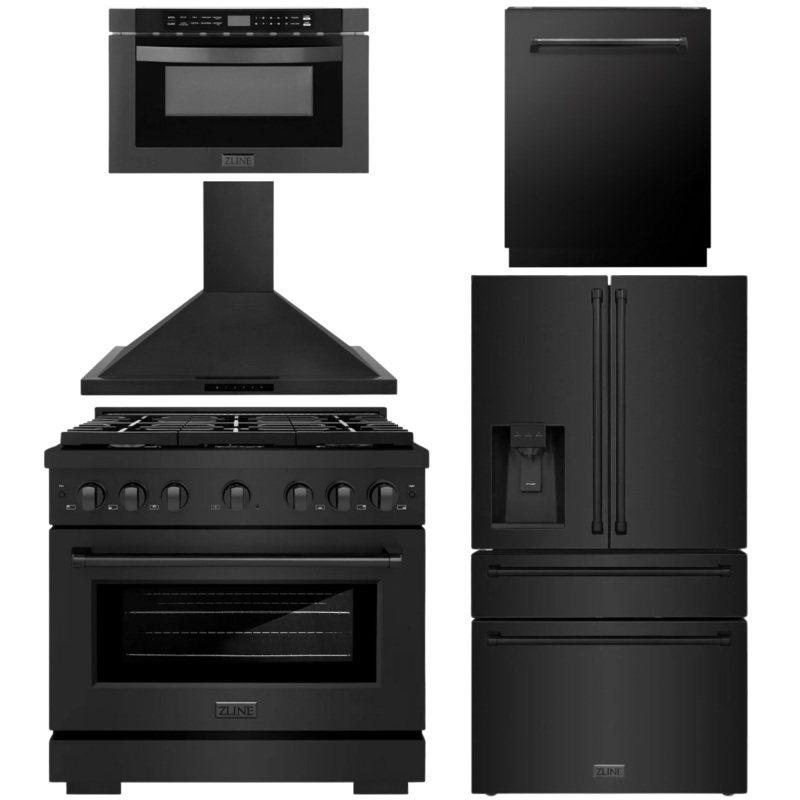 OO621835297422ZLINE Appliance Package – 36″ Gas Range, Range Hood, 36″ Refrigerator with Water/Ice Dispenser, 24″ Microwave Drawer and Dishwasher in Black Stainless Steel
