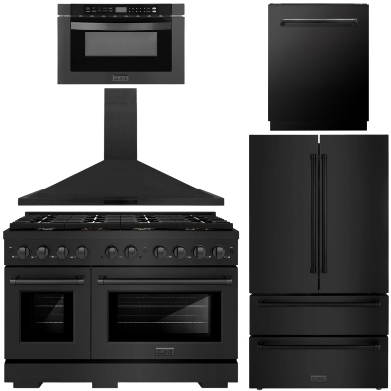 OO621835297506ZLINE Appliance Package – 48″ Dual Fuel Range, Range Hood, 36″ Refrigerator with Ice Maker, 24″ Microwave Drawer and Dishwasher in Black Stainless Steel