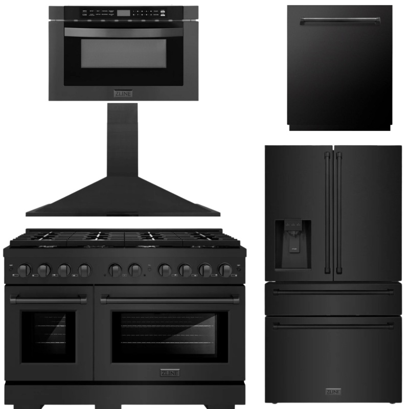ZLINE Appliance Package – 48″ Dual Fuel Range, Range Hood, 36″ Refrigerator with Water/Ice Dispenser, 24″ Microwave Drawer and Dishwasher in Black Stainless Steel