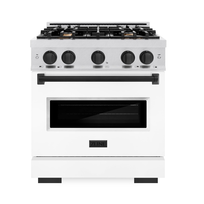 Luxury isnt meant to be left desiredits meant to be attainable. The ZLINE Autograph Edition 30 in. 4.2 cu. ft. Classic Dual Fuel Range with 4 Burner Gas Cooktop and Electric Convection Oven in Satin Stainless Steel with White Matte Door and Matte Black Accents (CDRSZ-WM-30-MB) combines the elegance of a hand-finished porcelain gas cooktop with 4 Italian-made auto-reignition burners, an electric convection oven with an energy-efficient cooling fan to ensure quiet operation, a beautiful white matte door with a Landscape window design, and stunning matte black knobs and handle allowing you to master every meal. With a modern, timeless style and refined functionality, ZLINE Classic Dual Fuel Ranges are masterfully crafted to deliver an elevated culinary experience.