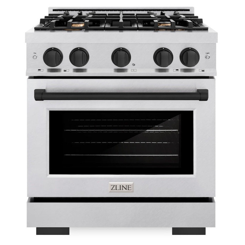 Luxury isnt meant to be left desiredits meant to be attainable. The ZLINE Autograph Edition 30 in. 4.2 cu. ft. Select Dual Fuel Range with 4 Burner Gas Cooktop and Electric Convection Oven in Satin Stainless Steel with Matte Black Accents (HDRSZ-30-MB) combines the elegance of a hand-finished porcelain gas cooktop with 4 Italian-made auto-reignition burners, an electric convection oven with an energy-efficient cooling fan to ensure quiet operation, a Horizon oven door window design, and stunning matte black knobs and handle allowing you to master every meal. With a modern, timeless style and refined functionality, ZLINE Select Dual Fuel Ranges are masterfully crafted to deliver an elevated culinary experience.