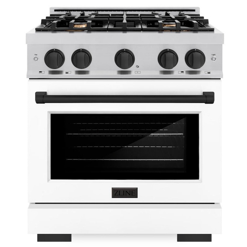 Luxury isn’t meant to be desired – it’s meant to be attainable. The ZLINE Autograph Edition 30 in. 4.2 cu. ft. Select Dual Fuel Range with 4 Burner Gas Cooktop and Electric Convection Oven in Stainless Steel with White Matte Door and Matte Black Accents (HDRZ-WM-30-MB) combines the elegance of a hand-finished porcelain gas cooktop with 4 Italian-made auto-reignition burners, an electric convection oven with an energy-efficient cooling fan to ensure quiet operation, a beautiful white matte door with a Horizon window design, and stunning matte black knobs and handle allowing you to master every meal. With a modern, timeless style and refined functionality, ZLINE Select Dual Fuel Ranges are masterfully crafted to deliver an elevated culinary experience.
