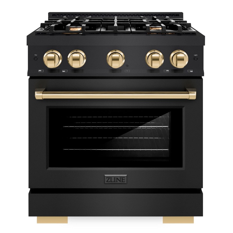 Luxury isn’t meant to be desired – it’s meant to be attainable. The ZLINE Autograph Edition 30 in. 4.2 cu. ft. Select Gas Range with 4 Burner Cooktop and Convection Gas Oven in Black Stainless Steel and Polished Gold Accents (HGRBZ-30-G) combines the elegance of a hand-finished porcelain gas cooktop with 4 Italian-made auto-reignition burners, a gas convection oven with an energy-efficient cooling fan to ensure quiet operation, a Horizon oven door window design, and stunning polished gold knobs and handle allowing you to master every meal. With a modern, timeless style and refined functionality, ZLINE Select Gas Ranges are masterfully crafted to deliver an elevated culinary experience.