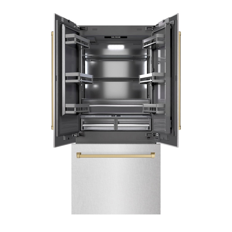 Luxury isnt meant to be left desiredits meant to be attainable. The ZLINE Autograph Edition 36 in. 19.6 cu. ft. French Door Built-In Bottom Freezer Refrigerator with Water Dispenser and Ice Maker in Satin Stainless Steel with Graphite Gray Interior and Champagne Bronze Accents (GRBIVZ-SN-36-CB) provides the ultimate upgrade to the center of your home by pairing premium dual cooling technology with enhanced storage capacity for multiple grocery items. Achieve ZLINE Attainable Luxury excellence with innovative features designed to enhance your kitchens cooling and freezing capability.