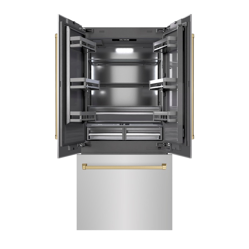 Luxury isn’t meant to be desired – it’s meant to be attainable. The ZLINE Autograph Edition 36″ 19.6 cu. ft. French Door Built-In Bottom Freezer Refrigerator with Water Dispenser and Ice Maker in Stainless Steel with Graphite Gray Interior and Champagne Bronze Accents (GRBIVZ-304-36CB) provides the ultimate upgrade to the center of your home by pairing premium dual cooling technology with enhanced storage capacity for multiple grocery items. Achieve ZLINE Attainable Luxury excellence with innovative features designed to enhance your kitchen’s cooling and freezing capability.