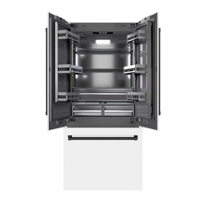 Luxury isn’t meant to be desired – it’s meant to be attainable. The ZLINE Autograph Edition 36″ 19.6 cu. ft. French Door Built-In Bottom Freezer Refrigerator with Water Dispenser and Ice Maker in White Matte with Graphite Gray Interior and Matte Black Accents (GRBIVZ-WM-36-MB) provides the ultimate upgrade to the center of your home by pairing premium dual cooling technology with enhanced storage capacity for multiple grocery items. Achieve ZLINE Attainable Luxury excellence with innovative features designed to enhance your kitchen’s cooling and freezing capability.