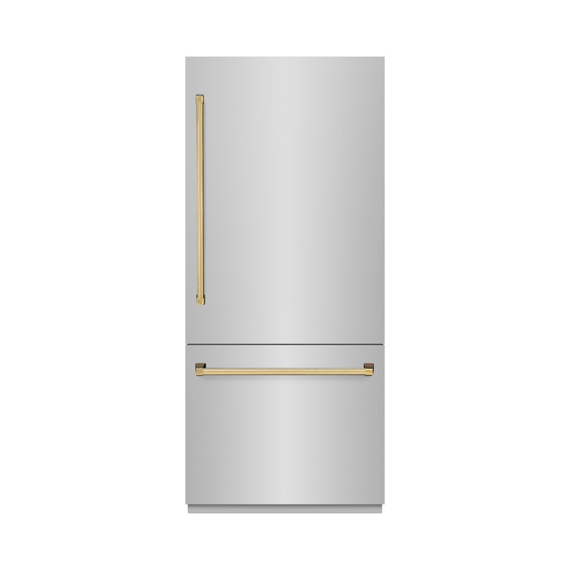 Luxury isn’t meant to be desired – it’s meant to be attainable. The ZLINE Autograph Edition 36″ 19.8 cu. ft. Built-In Bottom Freezer Refrigerator with Water Dispenser and Ice Maker in Stainless Steel with Polished Gold Accents (RBITZ-304-36G) provides the ultimate upgrade to the center of your home by pairing premium dual cooling technology with enhanced storage capacity for multiple grocery items. Achieve ZLINE Attainable Luxury excellence with innovative features designed to enhance your kitchen’s cooling and freezing capability.